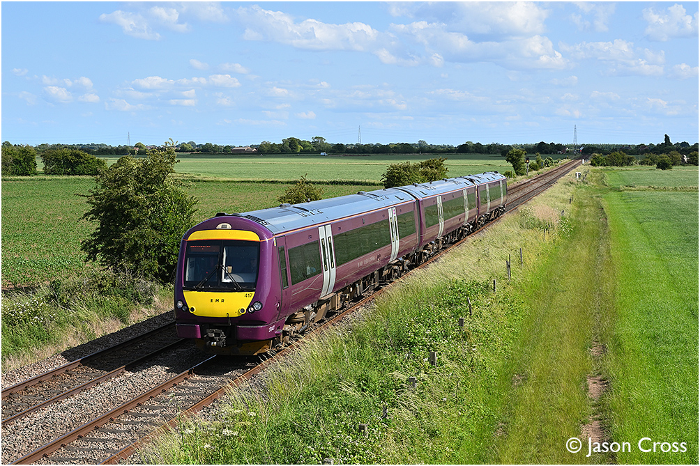 170417 passes Lymn Bank near Thorpe Culvert with the 2O22 1615 Skegness to Nottingham. Date: 14 June 2025 Manipulation Notes: None Camera mounted on a tall pole and remotely fired