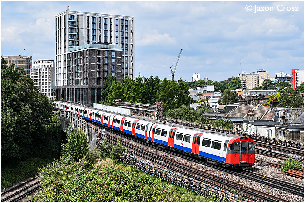 1973 Tube Stock 154-554-354+357-557-157 passes Chiswick Park with an Arnos Grove to Heathrow Terminal 4 Piccadilly Line service. Date: 13 July 2025 Manipulation Notes: None Camera mounted on a tall pole and remotely fired