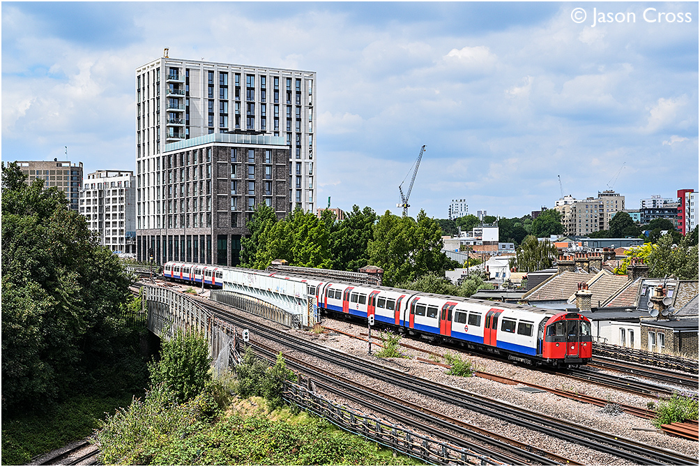 1973 Tube Stock 101-501-301+881-680-880 passes Chiswick Park with a Rayners Lane to Cockfosters Piccadilly Line service. Date: 13 July 2025 Manipulation Notes: None Camera mounted on a tall pole and remotely fired