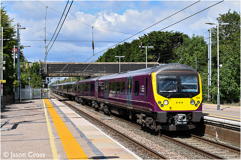 360104 and 360106 race through Harlington with the 1H36 1406 Corby to St Pancras International. Date: 30 July 2025 Manipulation Notes: None