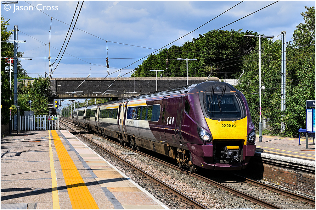 222019 races through Harlington with the 1B55 1350 Nottingham to St Pancras International. Date: 30 July 2025 Manipulation Notes: None