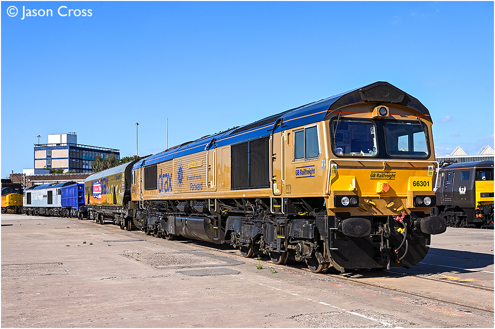 GB Railfreight's 66301 'Drax Power Station 50' in a special gold livery to mark 50 years of Drax. 'The Greatest Gathering' Rail 200 Event at Alstom's Derby Litchurch Lane Works. Date: 2 August 2025 Manipulation Notes: None