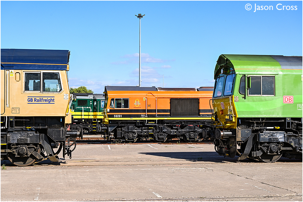 GB Railfreight, DB Cargo and Freightliner are all represented in this photo; 66301, 59201 and 66004. 'The Greatest Gathering' Rail 200 Event at Alstom's Derby Litchurch Lane Works. Date: 2 August 2025 Manipulation Notes: None