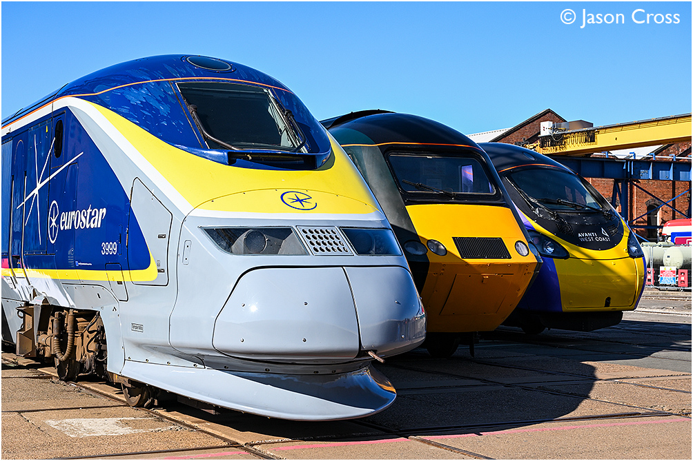 High Speed line up featuring Eurostar 3999, Inter City 125 43004 and Pendolino 390119. 'The Greatest Gathering' Rail 200 Event at Alstom's Derby Litchurch Lane Works. Date: 2 August 2025 Manipulation Notes: None