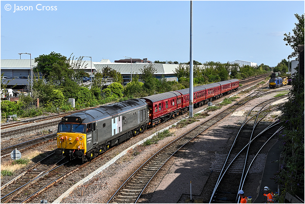 50050 approaches Leicester with London Underground's Inspection Saloon and 4-TC set in tow running as a 5Z50 1005 Chaddesden Sidings to Ruislip Depot. Date: 6 August 2025 Manipulation Notes: None