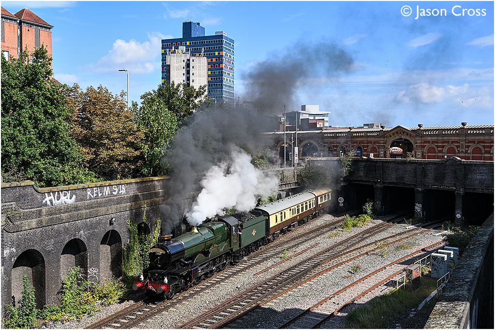 7029 'Clun Castle' departs from Leicester with a 1Z73 1025 Leicester to Stratford upon Avon 'Shakespeare Express' railtour. Date: 10 August 2025 Manipulation Notes: None Camera mounted on a tall pole and remotely fired