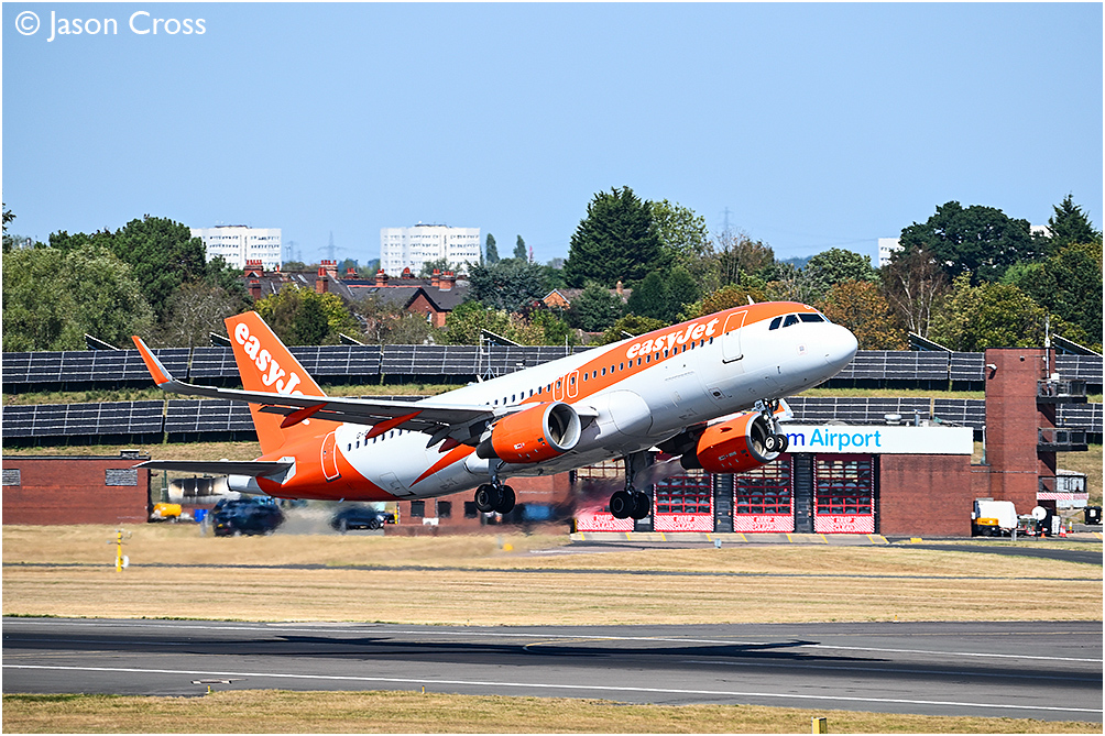 Easyjet Airbus A320 G-EZOF takes off from Birmingham Airport with a flight for Edinburgh. Date: 25 August 2025 Manipulation Notes: None