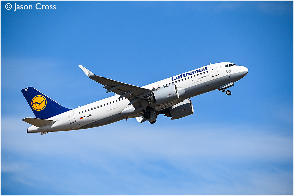 Lufthansa Airbus A320 D-AINC departing from Birmingham for Frankfurt. Date: 25 August 2025 Manipulation Notes: None
