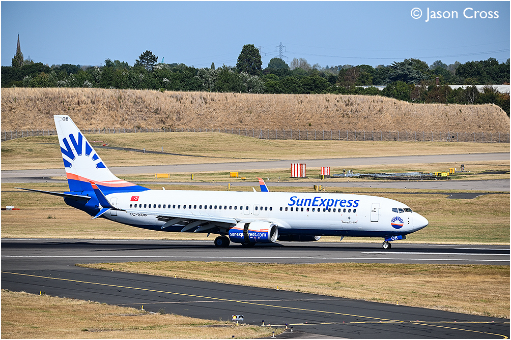 Sun Express Boeing 737 TC-SOB captured shortly after landing at Birmingham Airport with a flight from Antalya. Date: 25 August 2025 Manipulation Notes: None