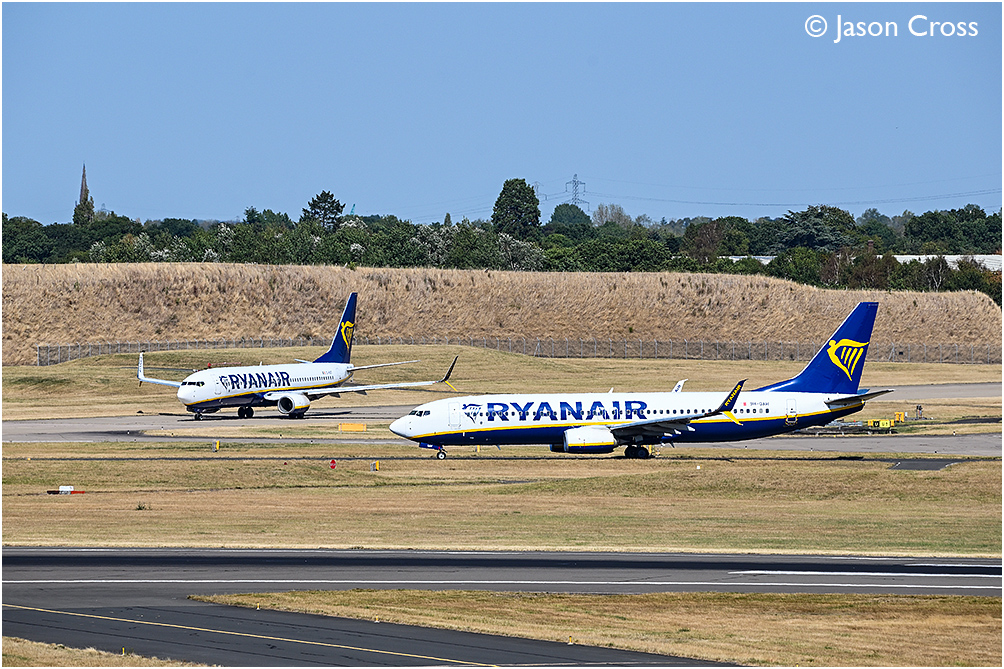 Ryanair Boeing 737 double at Birmingham Airport with 9H-QAH nearest the camera with a flight for Barcelona and EI-EST with a flight for Chania. Date: 25 August 2025 Manipulation Notes: None