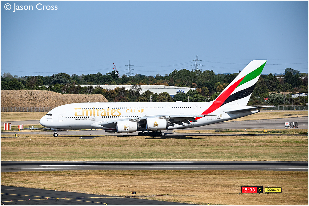 Emirates Airbus A380 A6-EUX taxiing to the runway at Birmingham Airport prior to departure to Dubai. Date: 25 August 2025 Manipulation Notes: None