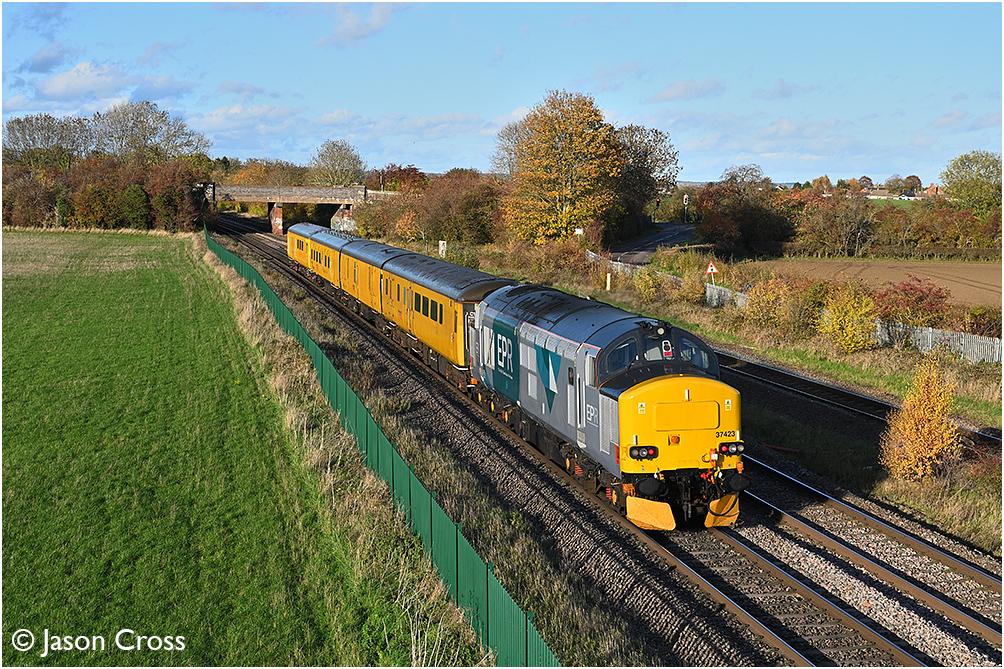 37423 passes Thurmaston on the rear of a 3Z06 1200 Ferme Park Reception Siding to Derby RTC infrastructure monitoring train. Date: 2 November 2025 Manipulation Notes: None Camera mounted on a tall pole and remotely fired