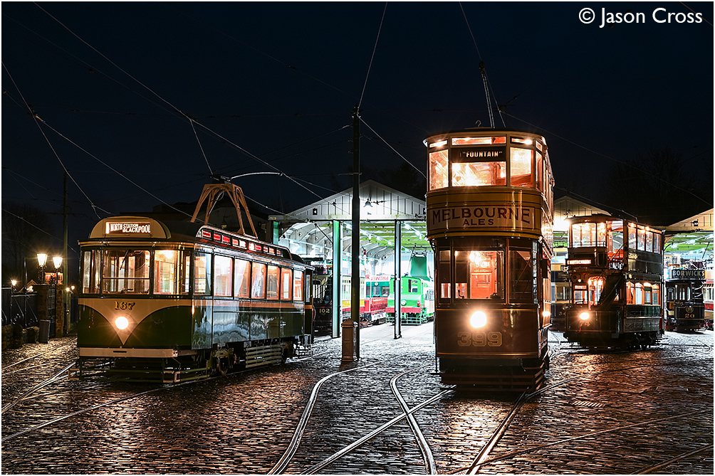 Blackpool 167, Leeds 399 and Sheffield 74 on the depot fan. Crich Tramway Village 'Tramlight' event. Date: 9 November 2025 Manipulation Notes: None