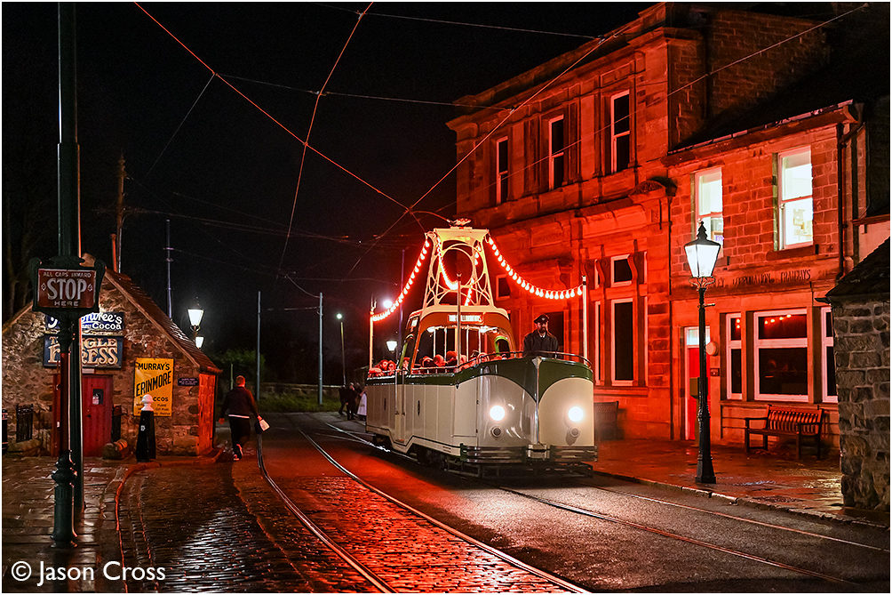 Blackpool 236 departs from Town End. Crich Tramway Village 'Tramlight' event. Date: 9 November 2025 Manipulation Notes: None