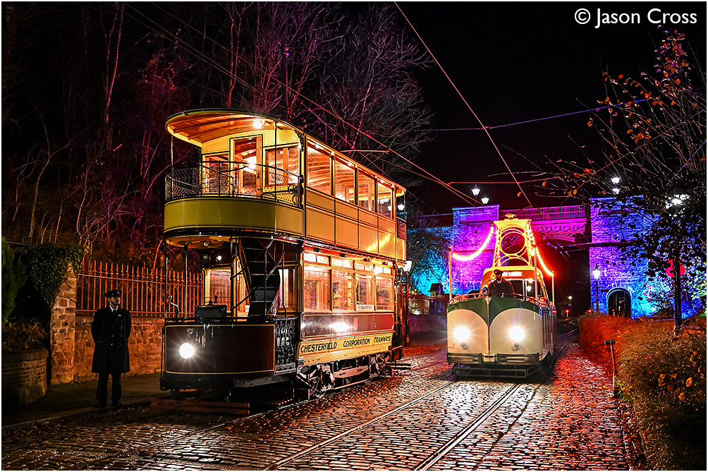 Chesterfield 7 waits to enter the tram depot at the end of the evening as Blackpool 236 with the last service of the night (and season). Crich Tramway Village 'Tramlight' event. Date: 9 November 2025 Manipulation Notes: None