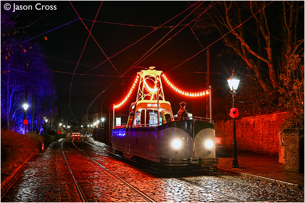 Blackpool 236 arrives back at the tram depot at the end of the evening. Crich Tramway Village 'Tramlight' event. Date: 9 November 2025 Manipulation Notes: None