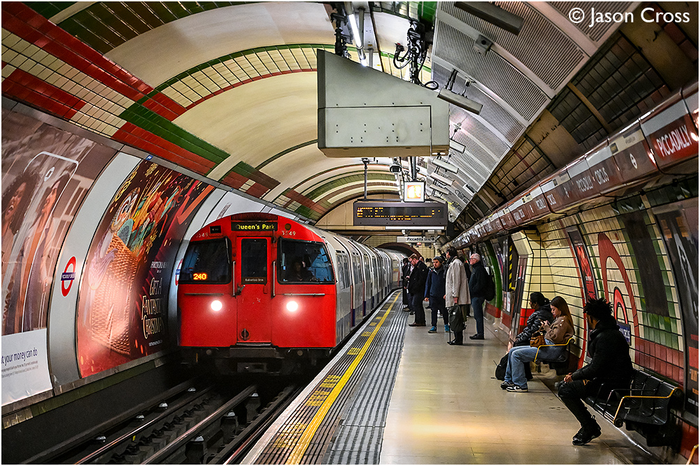 1972 Tube Stock 3549-4549-3449+3350-4350-4250-3250 arrives at Piccadilly Circus with an Elephant & Castle to Queen's Park service. Date: 19 November 2025 Manipulation Notes: None
