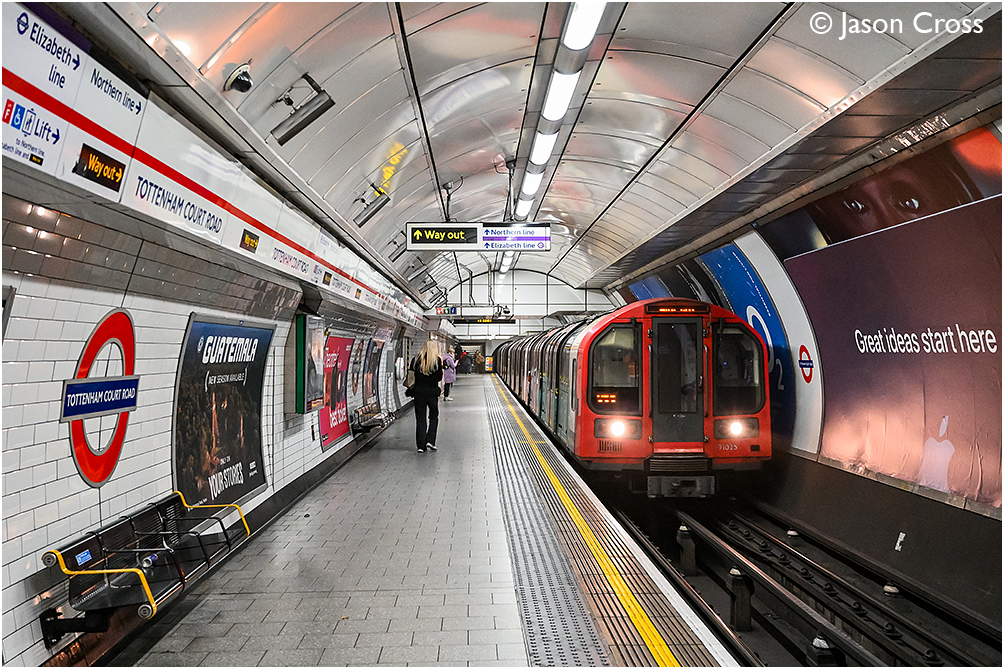 91025 leads a Hainault to White City via Newbury Park Central Line service into Tottenham Court Road. Date: 19 November 2025 Manipulation Notes: None