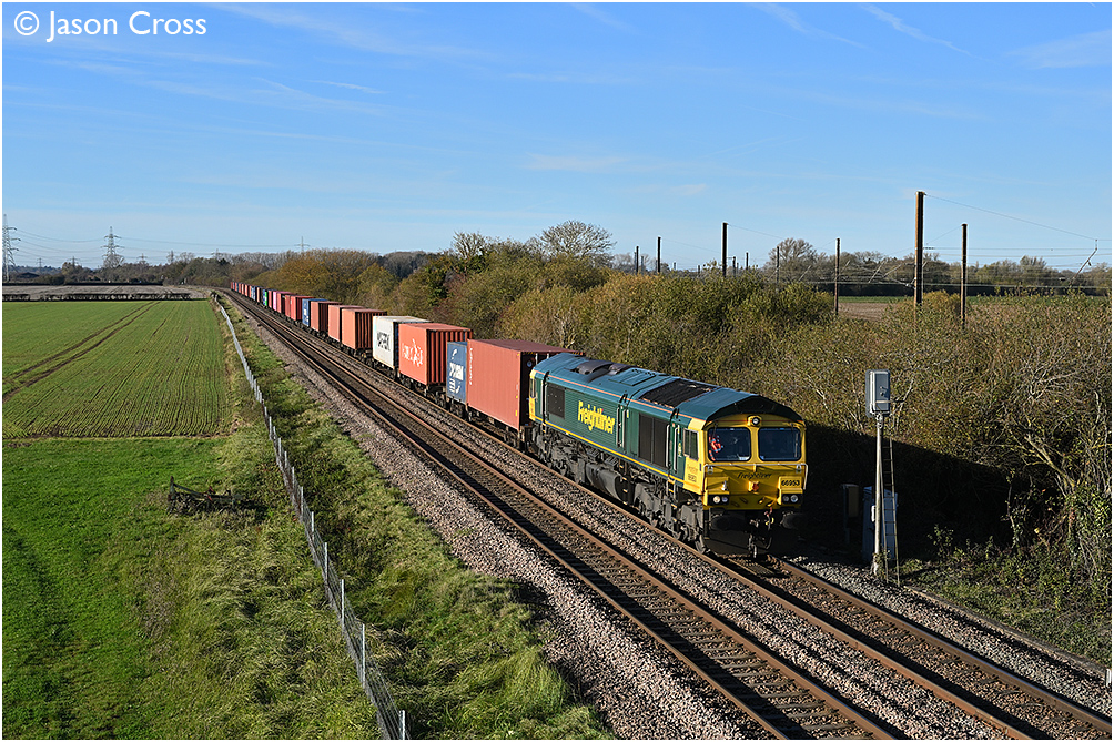 66953 recovers from a signal check on the approach to Helpston with 4L93 1034 Lawley Street Felixstowe North. Date: 21 November 2025 Manipulation Notes: None Camera mounted on a tall pole and remotely fired