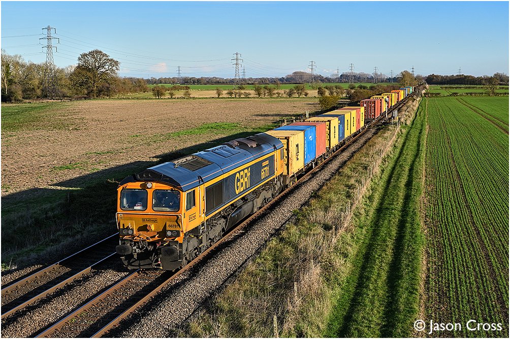 66781 'Ratcliffe Power Station' approaches Uffington with 4M23 1028 Felixstowe North to Hams Hall. Date: 21 November 2025 Manipulation Notes: None Camera mounted on a tall pole and remotely fired