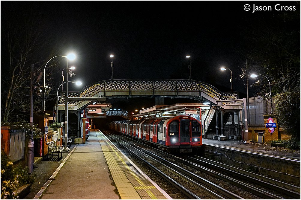 91117 leads a West Ruislip to Epping Central Line service into Theydon Bois. Date: 23 November 2025 Manipulation Notes: None
