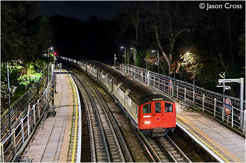 The 8-car 1962 Tube Stock Rail Adhesion Train passes through Roding Valley while working train 488 from Hainault to Hainault via