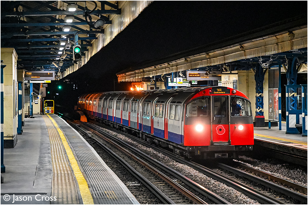 1973 Tube Stock 157-557-357+354-554-154 calls at Turnham Green with a Heathrow Terminal 5 to Cockfosters Piccadilly Line service. Date: 23 November 2025 Manipulation Notes: None