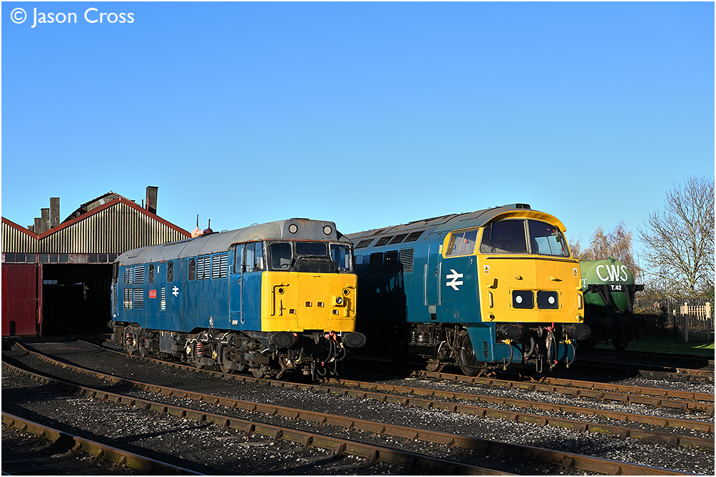 D1023 'Western Fusilier' and 31270 'Athena' posed in front of the main engine shed at Didcot. Timeline Events photo charter. Date: 29 November 2025 Manipulation Notes: None