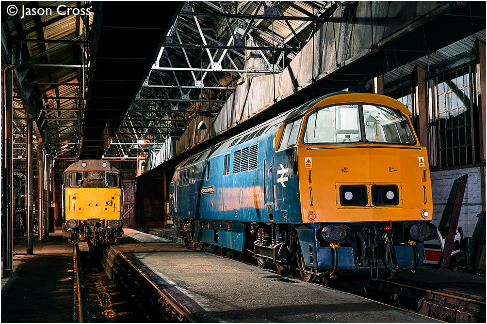 D1023 'Western Fusilier' and 31270 'Athena' inside the shed at the Didcot Railway Centre. Timeline Events photo charter. Date: 29 November 2025 Manipulation Notes: None
