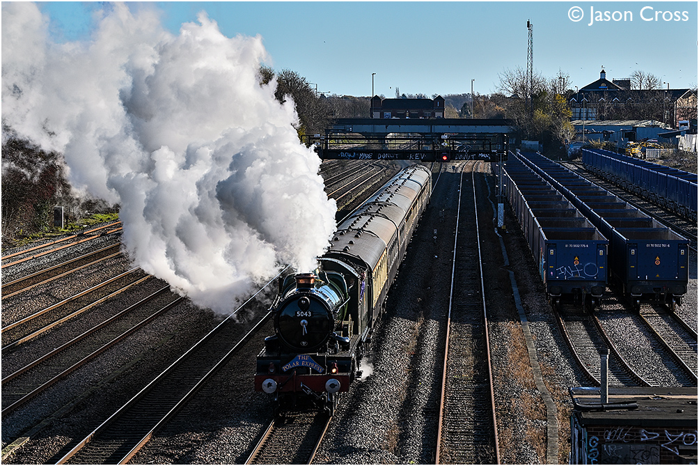5043 'Earl of Mount Edgcumbe' passes Small Heath with a 5Z12 1150 Tyseley Steam Trust to Birmingham Moor Street ECS. Date: 30 November 2025 Manipulation Notes: None