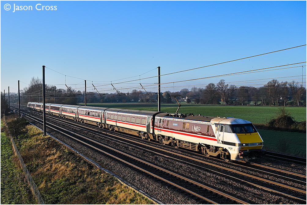 91127 'Neville Hill' heads north at Offord Cluny with 1D06 0833 London King's Cross to Leeds. Date: 13 December 2025 Manipulation Notes: None Camera mounted on a tall pole and remotely fired