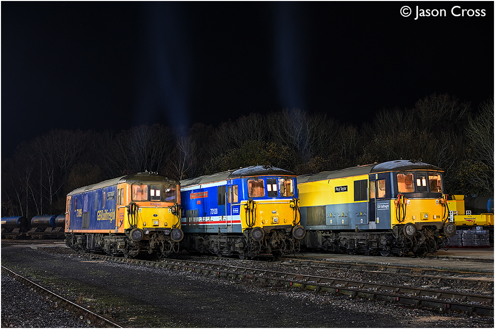 73109 'Battle of Britain 80th Anniversary', 73128 'Kent & East Sussex Railway' and 73119 'Paul Taylor' at Tonbridge West Yard. Northern Diesel Photo Charters photo shoot. Date: 13 December 2025 Manipulation Notes: None