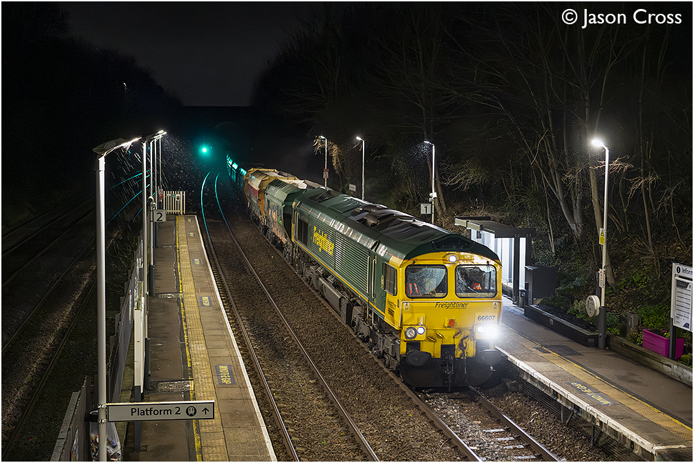 66607 passes Barrow-upon-Soar with 6L26 Barrow Hill to Ely Papworths stone hoppers. Date: 15 December 2025 Manipulation Notes: None