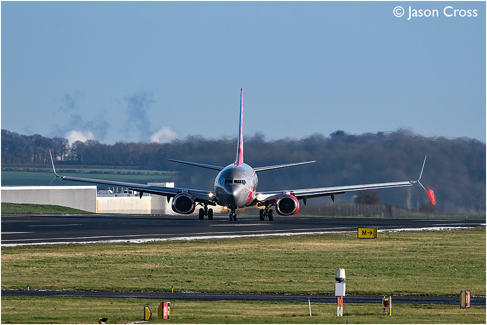 Jet2 Boeing 737 G-JZBU turns off the runway at East Midlands Airport after arriving from Alicante. Date: 4 January 2026 Manipulation Notes: None