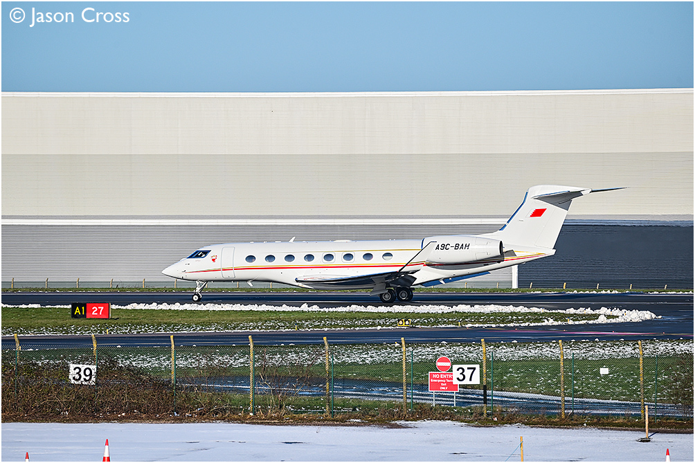 Bahrain Royal Flight Gulfstream G650 A9C-BAH lines up to depart from East Midlands Airport. Date: 10 January 2026 Manipulation Notes: None