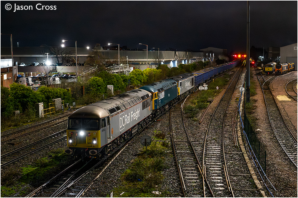 56103, 56045 and 60029 'Ben Nevis' pass Leicester Depot at the head of 6A23 1925 Chaddesden Sidings to Wembley Reception Sidings. Date: 11 January 2026 Manipulation Notes: None