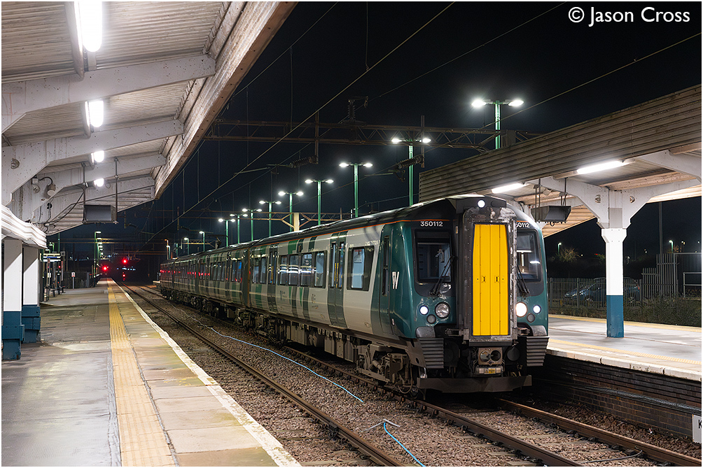 350112 arrives at Northampton with the 2Y74 2115 Birmingham New Street to Northampton. Date: 4 February 2026 Manipulation Notes: None
