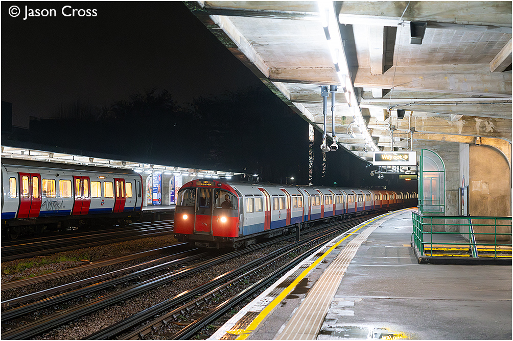 A Heathrow Terminal 5 to Arnos Grove Piccadilly Line service passes through Chiswick Park as an Ealing Broadway bound District Line service slows for its station stop. Date: 11 February 2026 Manipulation Notes: None