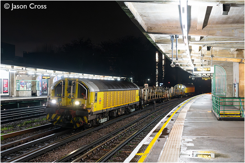 A Ruislip Depot to Walthamstow Central (Victoria Line) engineering train passes through Chiswick Park in the care of L45 and L29. Date: 11 February 2026 Manipulation Notes: None