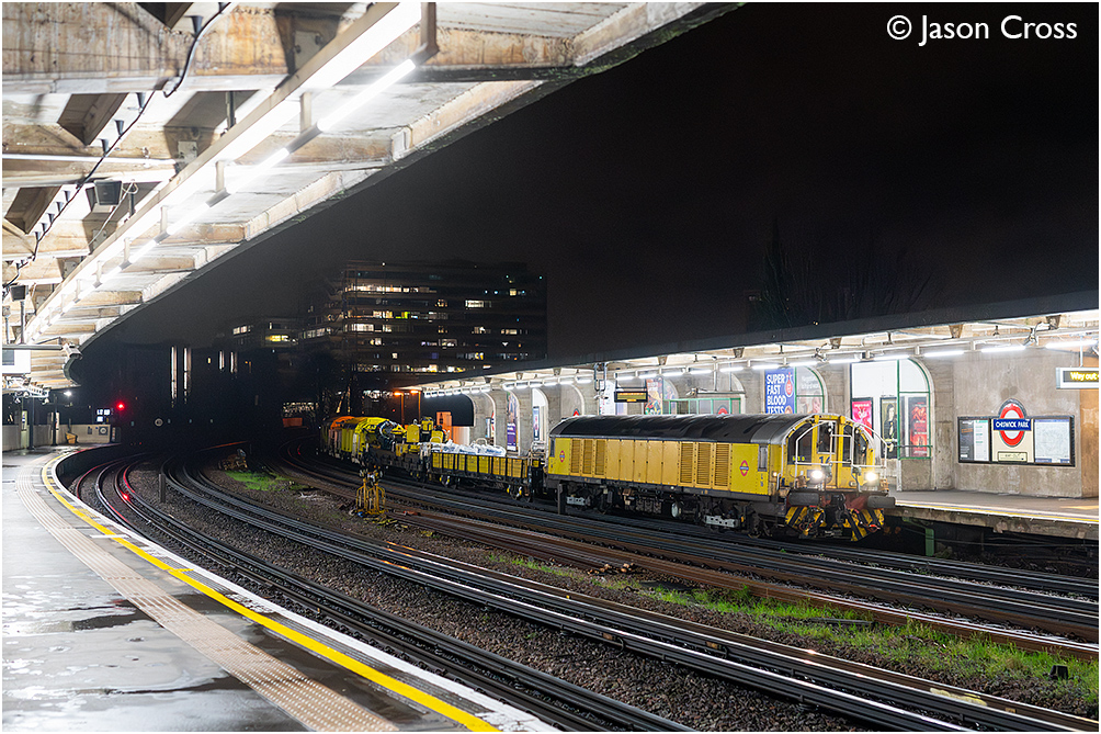 A Ruislip Depot to Ravenscourt Park engineering train passes through Chiswick Park behind battery loco L16. L19 was out of sight on the rear. The train consist included a railvac. Date: 11 February 2026 Manipulation Notes: None