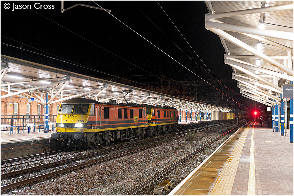 90013 and 90003 pull away from Rugby after pausing for a crew change with the 4S88 1433 Felixstowe North to Coatbridge. Date: 12 February 2026 Manipulation Notes: None