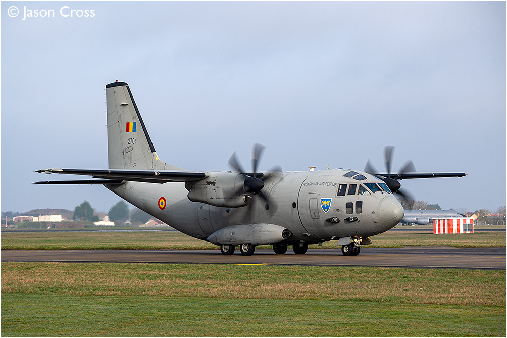 Romanian Air Force Alenia C-27J Spartan 2704 taxies out for a runway 28 departure from RAF Mildenhall. Date: 25 February 2026 Manipulation Notes: None