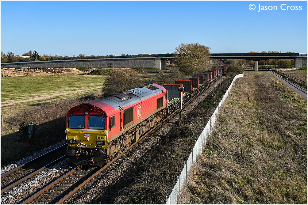 66074 passes Pinchbeck with the 4E25 1436 Biggleswade Plasmor to Heck Plasmor. Date: 18 March 2026 Manipulation Notes: None Camera mounted on a tall pole and remotely fired