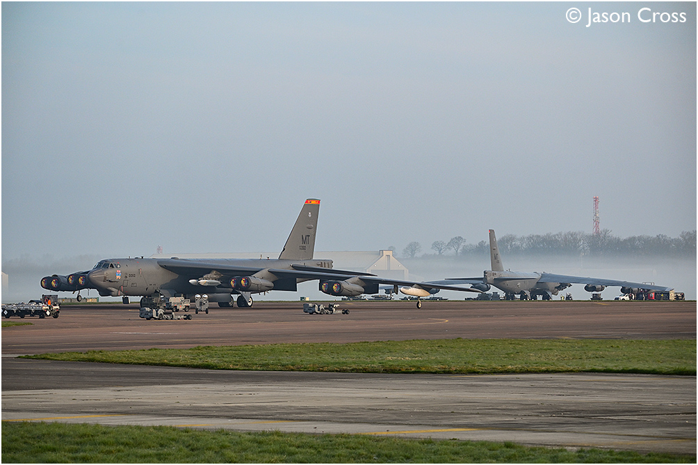 A busy scene at RAF Fairford with USAF Boeing B-52H bombers being prepared for bombing missions over Iran. Nearest to the camera is 60-0060, while in the background is 61-0035. Date: 21 March 2026 Manipulation Notes: None