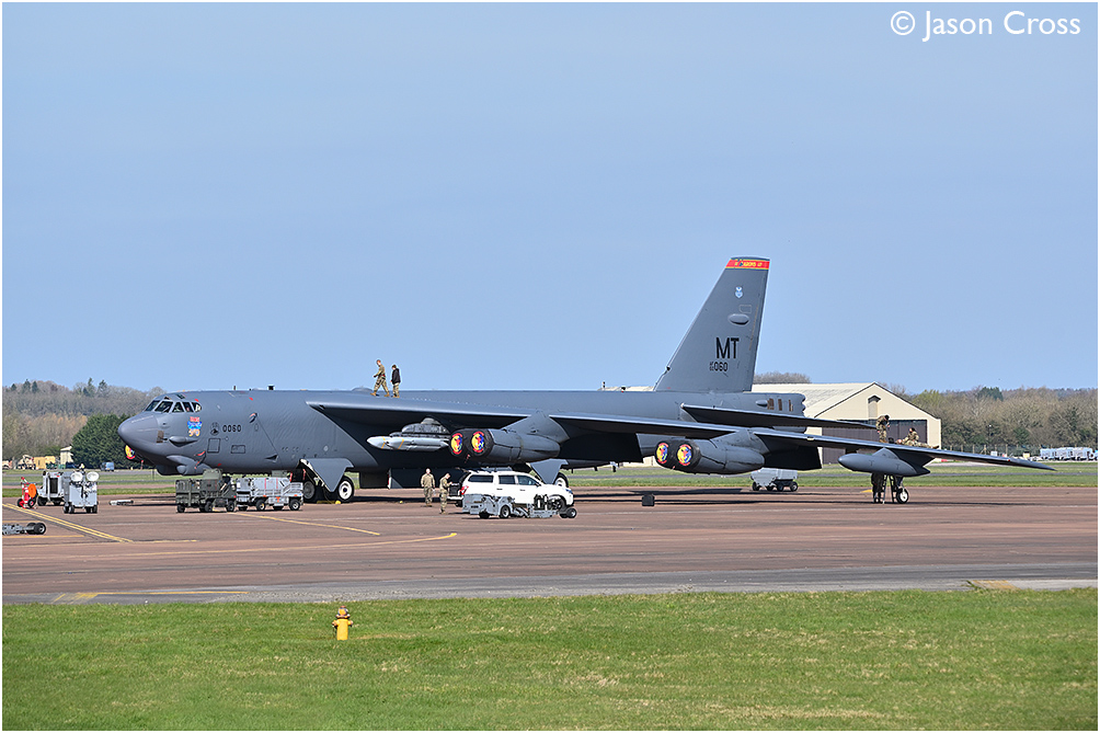 As part of the USA's Operation Epic Fury, Boeing B-52H 60-0060 is seen on the ground at RAF Fairford being prepared for its next mission. Date: 21 March 2026 Manipulation Notes: None