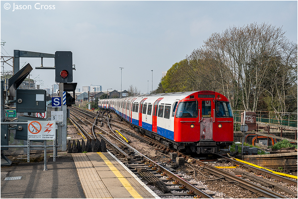 1972 Tube Stock 3248-4248-4348-3348+3448-4548-3548 exits Stonebridge Park number 21 Siding and enters the station to form the 1325 Bakerloo Line service to Elephant & Castle. Date: 23 March 2026 Manipulation Notes: None