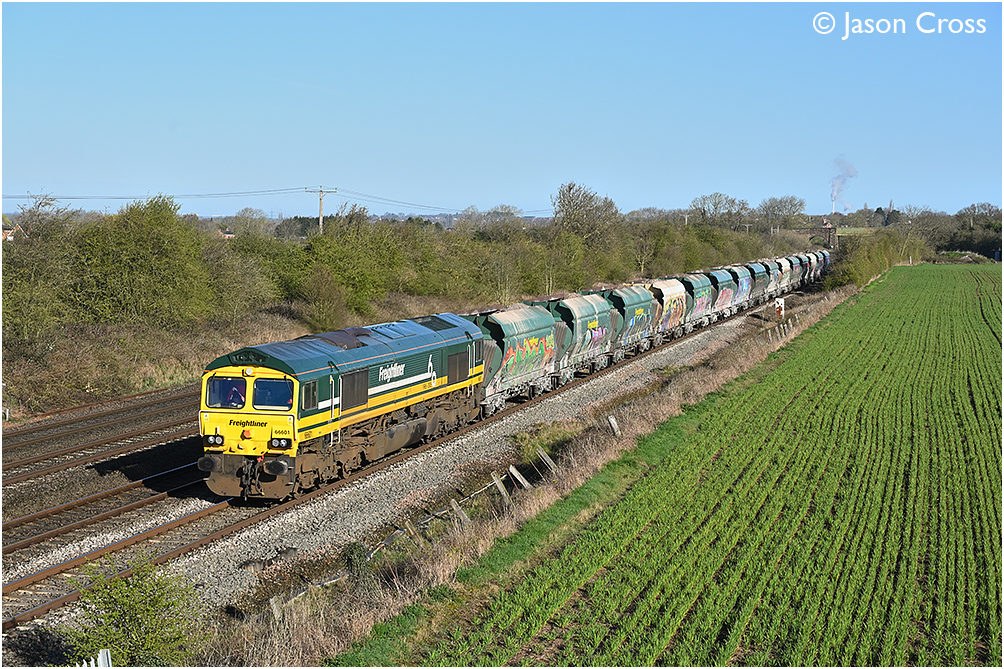 66601 passes Cossington with a 6Z42 0537 Tunstead Sidings to Barham stone hoppers. Date: 26 March 2026 Manipulation Notes: None