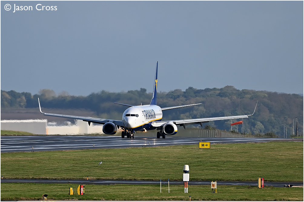 Ryanair Boeing 737 EI-EGA shortly after landing at East Midlands Airport with a flight from Malaga. Date: 31 October 2021 Manipulation Notes: None