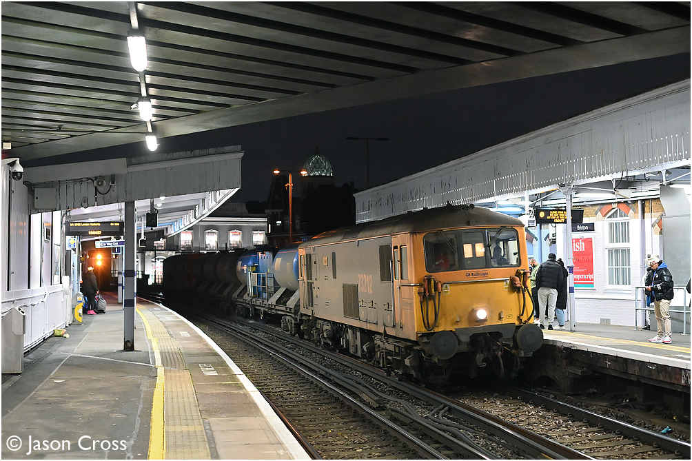 73212 and 73107 pass through Brixton with a 3W75 1522 Tonbridge West Yard to Tonbridge West Yard Railhead Treatment Train. Date: 6 November 2021 Manipulation Notes: None