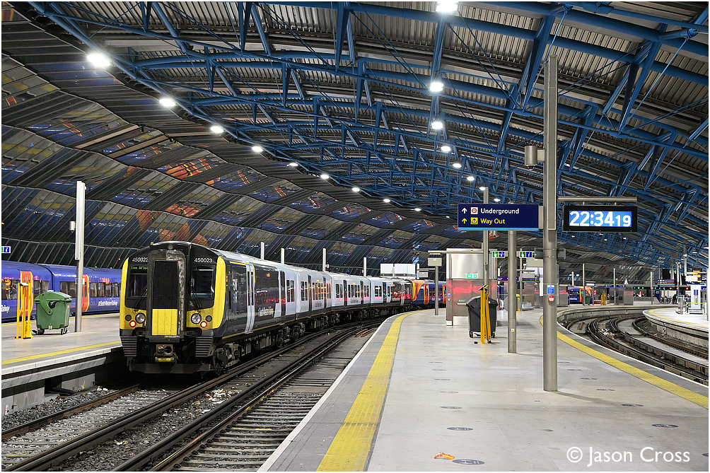 450023 and 450112 at London Waterloo having just arrived with 2S70 2103 from Weybridge. Date: 6 November 2021 Manipulation Notes: None